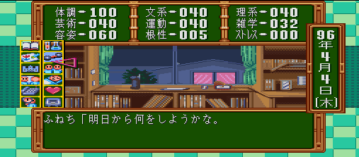 Essentilly, you either have "Turns" through the day, which basically allow you to do so many of those tasks (Sleep usually goes to the next day, however), or it gives you "Stamina Points" to complete them with. Of course, every girl has her preference, and you basically have to either pick one or two girls that pick your dominant trait (The one your auto-fire gamepad kept hitting), or balance all your traits out perfectly to get every girl.