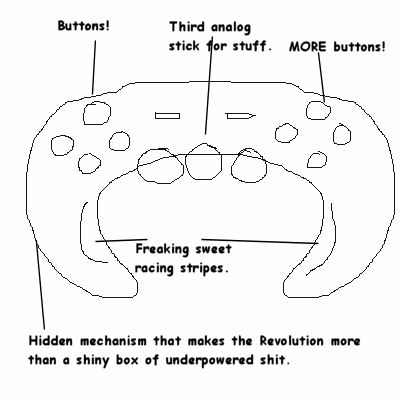 Okay, so with my SUPER L33T SKILLS, I have found some SECRET REVOLUTION CONTROLLER DESIGNS! Yes, apparently the people at Nintendo are tight-lipped about what the BS processor "Broadway" will do, but with a little payment (And reassurance that the 6th "Mario Party" wasnt a sign of franchise abuse), I got some information. Let's look. DESIGN ONE: ![]() Here we see Nintendo ripping off Sony's concept of the controller-that-also-functions-as-a-boomerang, except as we can see, there are extra buttons and a third control stick. What is it for? Just like the "Z" button on the Gamecube controller, no-one (Even Nintendo) has a clue. Oh, and don't forget the freaking sweet racing stripes. DESIGN TWO: ![]() HOLY CRAP MAN! Have we seen this before? Yep. Apparently, Nintendo's taking the Gamecube controller and making it super-awesome by giving it, yes, RACING STRIPES. I mean, my Mario or Zelda game will be so much better when I realize I'm playing on a controller with freaking RACING STRIPES. DESIGN THREE: ![]() Nintendo, still being unoriginal ("If we can't make a sequel of it, we'll steal it"), has now taken the Steel Battalion controller into consideration. Included are buttons to: - Control Mario - Make Mario Jump - Make Mario Throw - Make Mario pee - Make Mario Look around in Sunglasses, - Make Mario look around in Ray-Ban Sunglasses, - Make Mario change clothes, - Make Mario comb his hair, - Make Mario talk to himself, - Make Mario rock like he's Autistic, - Make Mario convince you that the gamecube WAS a decent system, - Make Mario convince you to kill yourself, and much much more. Also, there's a few other buttons on there that do nothing because, of course, they look cool. DESIGN FOUR: ![]() The Revolution official Desert Eagle! So all you Nintendo fans, when the Revolution with the super "Powerful" Broadway processor and "Innovative" ideas come out, you can kill yourself once you realize that even the 360 will trump it like how an abusive father beats his childeren. It's point and click! Overall, I know I've been mean to the Revolution. But hell, the more info that comes out about it, the more I laugh and expect a bunch of kids to be dissapointed. Then again, I'm not suprised that a lot of kids aren't dissapointed with their Gamecubes. But, whatever. |