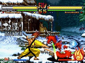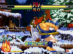 Samurai Shodown (Japanese title: 'Samurai Spirits' / ?????????) is the first game in SNK's popular series of fighting games. Its initial, primary distinction from its contemporaries (most significantly, Street Fighter II) was its time period, since it was set in the late 18th century. All of its characters also wielded weapons, and in addition to its unusual look, it also bore comparatively authentic music from the time period, rife with sounds of traditional Japanese instruments, such as the shakuhachi and shamisen. True to its use of bladed weapons, the game also included copious amounts of blood, though generally never as over-the-top as Mortal Kombat tended to be. Its overall aesthetic drew in the curious, and made SNK many fans.