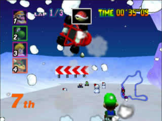 Mario Kart 64 is a racing video game for the Nintendo 64 game system for up to four players. It is the sequel to Super Mario Kart for the SNES. Players take control of characters from the Super Mario Bros. video game series and race around a variety of tracks while using several weapons including items that make the racers speed increase, turtle-shell projectiles and slippery banana peels. The game was developed and published by Nintendo and released on December 14, 1996. Music for the game was composed by Koji Kondo, who has also composed scores for many Nintendo games, and Kenta Nagata.