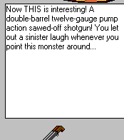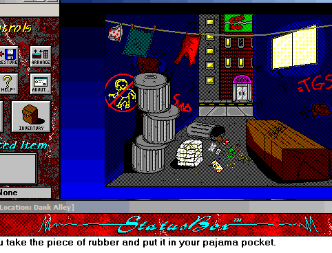 At the time, the company Epic Megagames (Yes, the people who now have Unreal Tournament) was one of the biggest creators of Shareware games on the market. Essentially, they contracted out to individuals who made games, but whatever. Dare to Dream was a project by Cliff Blezenski. You are a 10 year old boy who basically goes nuts during his sleep, and goes in a strange world with wierd people, confusing puzzles, and mirrors of his life at home. Strange, unique, and somewhat fun. ![]() Dare to Dream runs on some bastardized Visual Basic engine that basically pops up three windows: Your inventory/info/save/etc, your visual view, and the information window that describes everything going on. For example, double click a baloon in the game that you can pick up, and the baloon moves to your inventory, and the description tells you what you did. Lovely. The game is simplistic, but actually hard. It gives you two options- "Normal" mode and "Easy" mode- and sets you into the world. The Normal mode, unfortunately, is a little too difficult for anyone who can be impatient, because getting the "Chain Reaction" of items going that us adventure gamers are so fond of is harder than you'd think. The Easy mode, is, of course, very very easy. ![]() Overall, the game is hard, but short (It's shareware). While it does present some challenges, it really couldnt take more than 15 minutes for a standard gamer to get through it. Its an old game, and that's probably all that can be said for it. There are two other chapters to this game, but I would recommend straying from them, as they arent much longer or complex. ![]() Also, as an added bonus, this game is shareware, so you can download it on the internet! Go google it, it's a nice game, and it's a good time waster. As long as you're not paying for it.