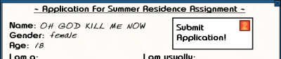 You think I'm kidding. Yes, gentlemen, marching under the same nominer as Kanon and Shuffle! comes a game that features no nudity, no sex, no heterosexual relationships, and certainly no fun. Made somewhere obviously not Japan, it seems to forget what Dating Simulation games are all about: Making loser guys feel like they have girlfriends, and they turn a "Dating Simulation" into something more akin to shoving a red hot poker in your eye and leaving it there while you try to make "Final Fight: Streetwise" not a piece of crap. When I originally got the game, I obviously wasn't looking for quality entertainment. Really, what I was lookng for is a break from good games. For the last month or so, it seems to me like I have reviewed nothing but good games. Well, that has to stop sometime. World of Warcraft, an upcoming review of Fable, Diablo II, Devil May Cry 3... I just needed a game to take my mind off the outstanding awesome gameplay. I needed something to return me to me, something to make me angry. And, suffice to say, this game did it in such a way, I don't think the word "Schoolgirl" invokes my inner passion anymore like it used to. Summer Schoolgirls is basically a fanmade project, which means you can and will experience the following things: - Shoddy and/or stolen artwork. - Very poorly designed coding featuring useless abilities and lacking key elements. - A shallow story featuring cookie cutter characters. - Generally, a boring time. Now, when I say fanmade, I don't mean this game is based off any particular anime. That's because if any Anime, Manga, or video game in the world was like the artwork and general visual style in this game, it would never see the light of day in any market. To put it bluntly, this game sucks. Let me now delve into the actual game and stop crying: ![]() Say hello to your character, some green haired girl looking suspiciously emo. I would be depressed too if a whole week of my life was at a college wasting my time with people I barely knew. But, regardless, she seems to survive enough to be strangely happy through the rest of the game. Then the game finally gets to brass tacks and lets you create your character by answering a set of questions and coming up with a name. That's fine, but asking me so blatantly feels somewhat stupid. "Do you like it cold in your room or hot?". That's the kinda stupid stuff only an All-Girl's college would ask, which makes me pretty glad I'm a guy. It's obvious what the choices are, generally gearing you toward one of two character styles: -Brooding, quiet, and smart, or -Loud, obnoxious and energetic. ![]() And obviously, you'll get to know the quiet girls more if you are quiet yourself, et al. I could read so far into it I almost got in robes, put rings on my fingers, and started selling palm readings. The characters in the game are lame in almost every aspect. Obviously made to fit in the above two choices I mentioned, you either meet loud friendly people who generally piss me off, fake or not, and then you meet quiet people who seem demure and "Cute". Apparently, there is no other such personality in this world. In this world, you can get a degree in Psychology easily: Just remember the rule- if her first word is "Umm", she's quiet, if her first word is "Hey!!!!", she's loud. Easiest degree ever, almost beating becoming a Liberal Arts major. ![]() Whoever did the art for this game even makes my coloring of Mike's awesome work in the Gametrash Christmas Flash look good. All of the characters look a suspicious form of intoxicated, and seem to mirror popular girl characters from miscellaneous sources (Like how I'm convinced the above girl, "Jen-jen", is a blatant ripoff of Yuna from Final Fantasy X, except sluttier). The big thing, though, was their eyes. Either they were huge, small, offset, warped, one was like slightly smaller or outright closed, and sometimes, they were all too shiny. This freaked me out, and I still have nightmares of the depth of their eyes. How does one get such huge eyeballs and such small bodies, genetic manipulation? And then it launches you off into the game. Ever found yourself watching the Lifetime network? Then this game is for you. Otherwise, stay the hell away. It took me about 15 minutes to find out where I had to go, purely because the "You did something" text was so insignificant I just blasted through it ignoring it. Eventually, I finally found my way around to different places and experiences, which seemed notably short, but whatever. You will make choices on occasion, such as (In the Cafeteria), "Eat Potatoes" or "Eat Turkey". But, let's not forget this game does a good job of, in the opening announcements, reminding us all of the dangers of roofies in an all-girls school: ![]() (PS: For those of you thinking this game might have such a part in which you have to worry, do note that I didn't see a male college student in the game. The only male I saw was a teacher, who looked like Hatori from Fruits Basket, who is a fruitcake). So, no purposely drinking laced Jagermeister and getting that Hentai scene- doesn't happen. ![]() So, if you look closely at the pictures, my name was "OH GOD KILL ME". And yes, that was my thought through this entire game. It's absolute crap. It's nice to see someone who actually speaks english do a Dating Simulation that's not just for the porn, but regardless, this was aboslutely the worst text-based game I've ever played, even beating out a collection of old DOS wannabe "Sex Fiction" games I found one time and promptly deleted. There is no better candidate for our worst rating than this game, and it's really quite sad. Maybe I would have liked it more if there was nudity? Nah, because I'd be afraid their nipples would look like their eyes.